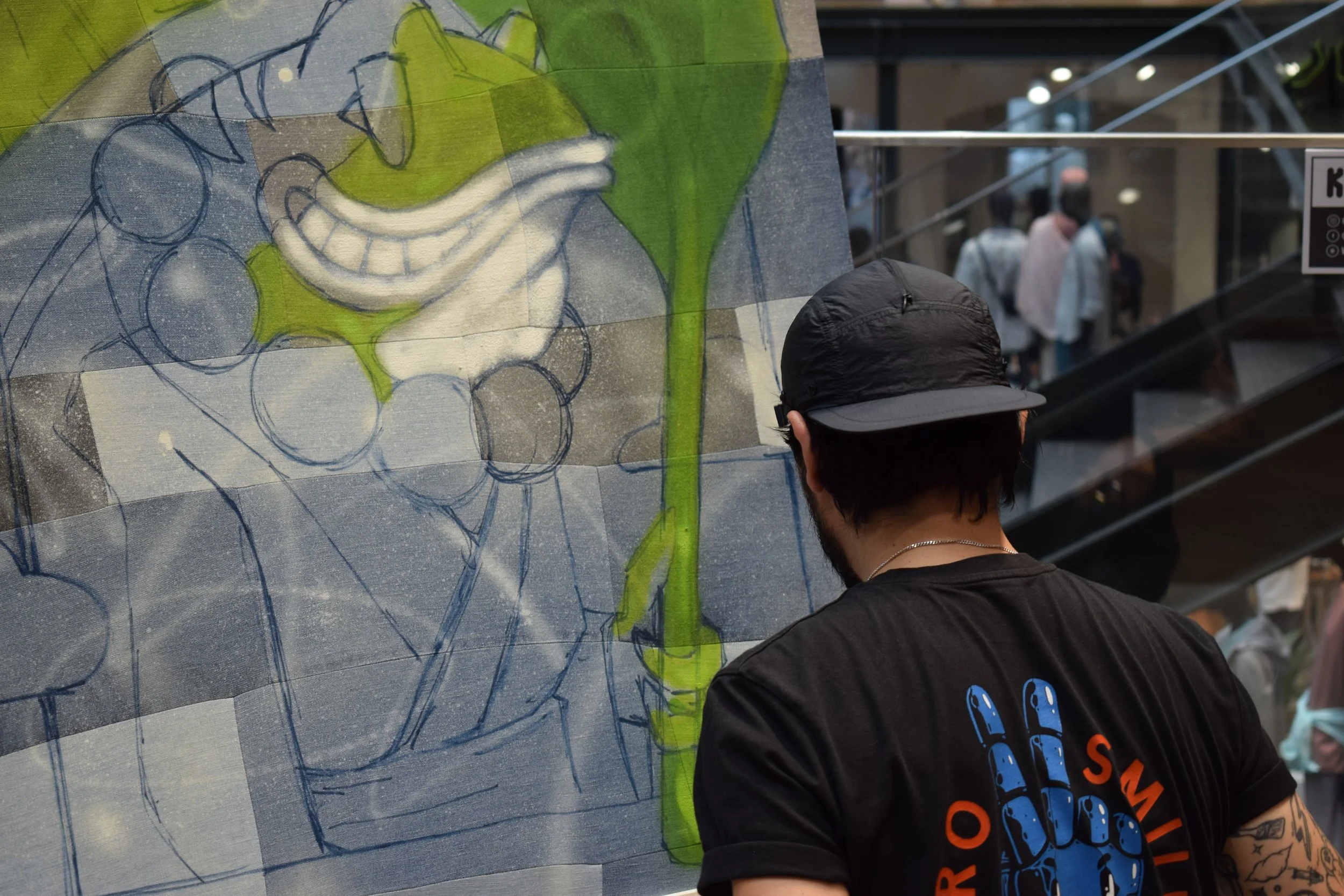 La sérigraphie sur textile recyclé, les toiles en jean, les œuvres à partir de sneakers ou de vêtements professionnels deviennent autant de terrains d’expression.